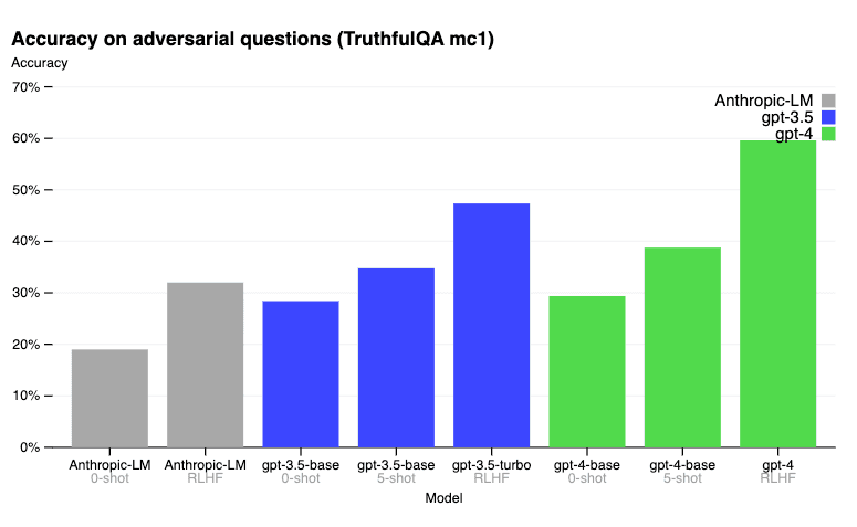 在TruthfulQA基准测试中,RLHF后训练使GPT-4比GPT-3.5更准确。以下是博客文章中报告的结果。